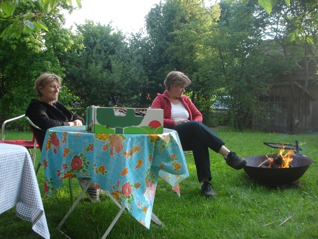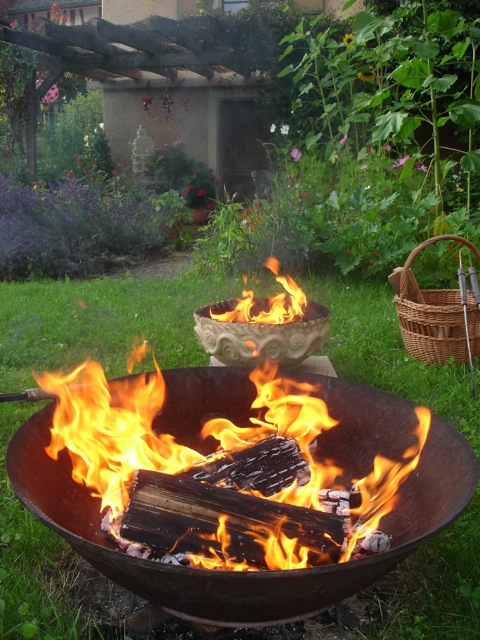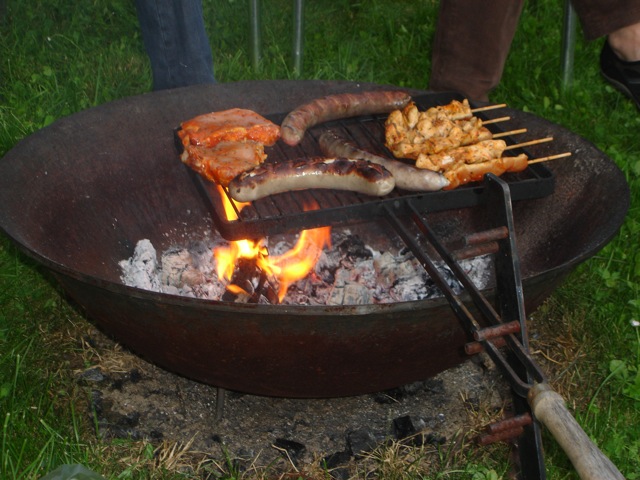 Es ist immer wieder eine Überraschung, die eigene Keramik nach dem Glasurbrand zu sehen. Endlich kann man die Stücke an denen zum Teil lange gearbeitet wurde in fertigem Zustand sehen. Auch an dieser Vernissage gab es viel zu bewundern. Schon bald prasselte das Feuer in den zwei Feuerschalen und wir waren froh, um die angenehme Wärme, die davon ausging. Nach und nach zogen wir die Stühle zum Feuer und schauten den brutzelnden Leckereien zu. Nochmals vielen Dank an alle Frauen für die feinen Salate, Desserts und Apéros, die Ihr mitgebracht habt!