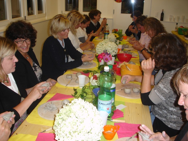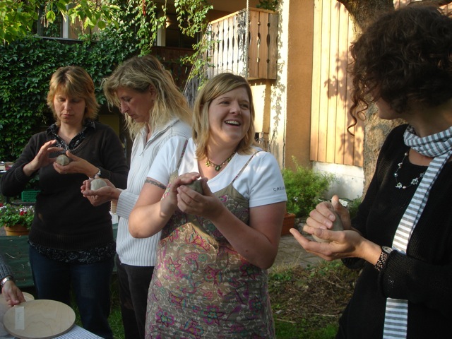 Und wie es in einer Töpferei so üblich ist, war der Ton nicht weit. Eigentlich sollte es ein Geheimnis bleiben, was aus den birnenförmigen Tongebilden werden sollte. Aber die Frauen kamen schnell darauf, ich hatte mich verraten. Als gegen Ende des Abends die Tonbirnen ausgehöhlt und wieder zusammengesetzt wurden, wussten schon alle, dass es eine Flöte werden sollte. Ein Ocarina (das heisst „kleines Gänschen“).